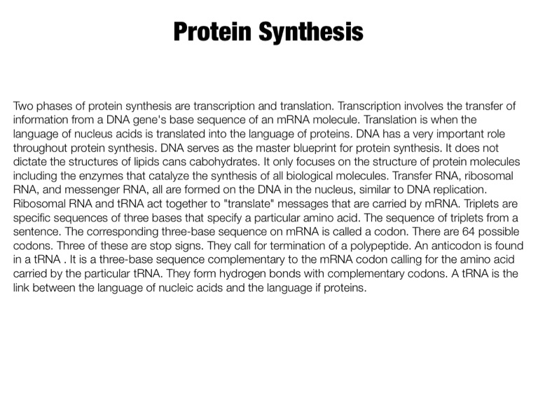 Two phases of protein synthesis are transcription and translation. Transcription involves the transfer of information from a DNA gene's base sequence of an mRNA molecule. Translation is when the language of nucleus acids is translated into the language of proteins. DNA has a very important role throughout protein synthesis. DNA serves as the master blueprint for protein synthesis. It does not dictate the structures of lipids cans cabohydrates. It only focuses on the structure of protein molecules including the enzymes that catalyze the synthesis of all biological molecules. Transfer RNA, ribosomal RNA, and messenger RNA, all are formed on the DNA in the nucleus, similar to DNA replication. Ribosomal RNA and tRNA act together to "translate" messages that are carried by mRNA. Triplets are specific sequences of three bases that specify a particular amino acid. The sequence of triplets from a sentence. The corresponding three-base sequence on mRNA is called a codon. There are 64 possible codons. Three of these are stop signs. They call for termination of a polypeptide. An anticodon is found in a tRNA . It is a three-base sequence complementary to the mRNA codon calling for the amino acid carried by the particular tRNA. They form hydrogen bonds with complementary codons. A tRNA is the link between the language of nucleic acids and the language if proteins.