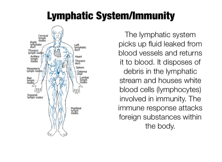The lymphatic system picks up fluid leaked from blood vessels and returns it to blood. It disposes of debris in the lymphatic stream and houses white blood cells (lymphocytes) involved in immunity. The immune response attacks foreign substances within the body.
