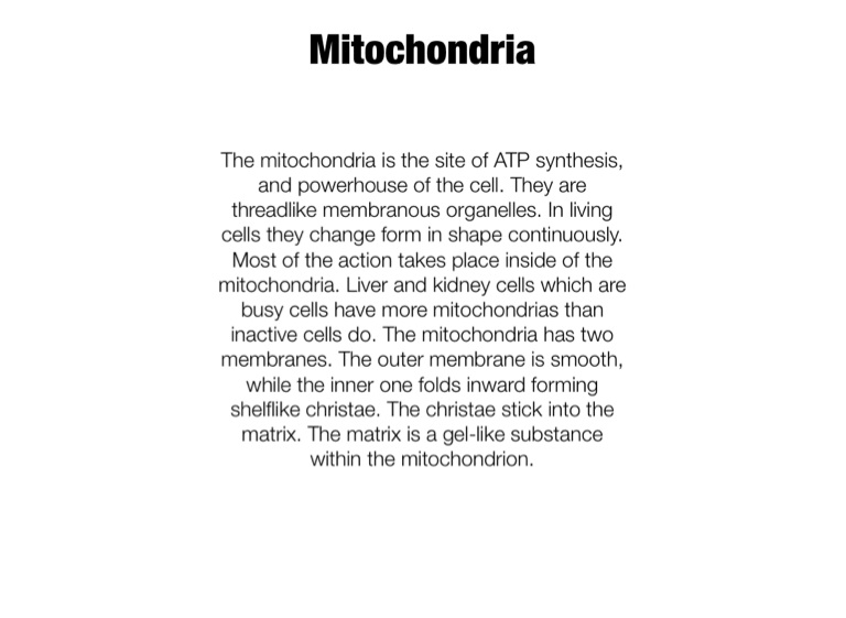 The mitochondria is the site of ATP synthesis, and powerhouse of the cell. They are threadlike membranous organelles. In living cells they change form in shape continuously. Most of the action takes place inside of the mitochondria. Liver and kidney cells which are busy cells have more mitochondrias than inactive cells do. The mitochondria has two membranes. The outer membrane is smooth, while the inner one folds inward forming shelflike christae. The christae stick into the matrix. The matrix is a gel-like substance within the mitochondrion.