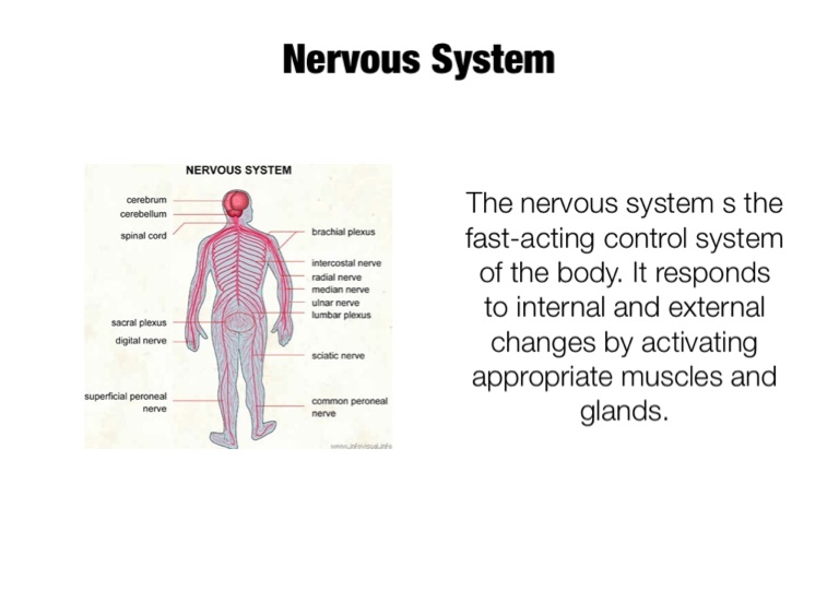 The nervous system s the fast-acting control system of the body. It responds to internal and external changes by activating appropriate muscles and glands.