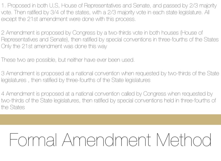 1. Proposed in both U,S, House of Representatives and Senate, and passed by 2/3 majority vote. Then ratified by 3/4 of the states, with a 2/3 majority vote in each state legislature. All except the 21st amendment were done with this process.