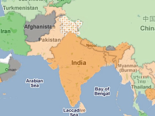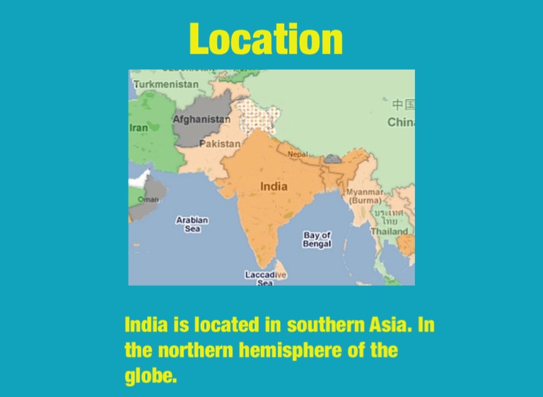 India is located in southern Asia. In the northern hemisphere of the globe.