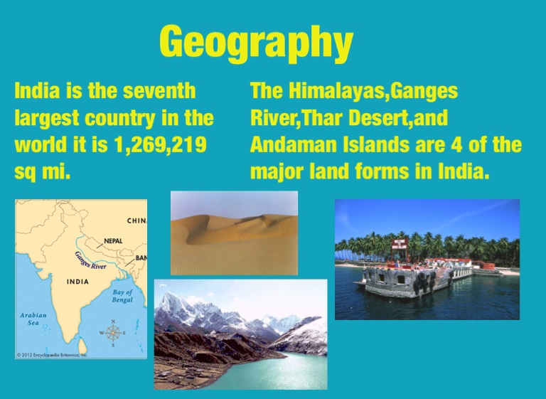 The Himalayas,Ganges River,Thar Desert,and Andaman Islands are 4 of the major land forms in India.