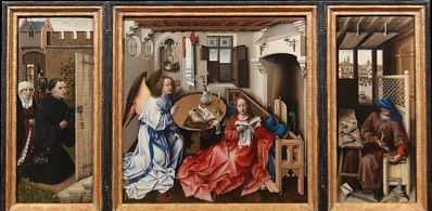 The priest and nun in the first room are kneeling down and praying out side of the room that the angle is in. You can see both warm and cool colors in the piece which makes a lot of contrast. You can see it in the nun and the priest, the angel and the woman, and the servants cloak and his hat.