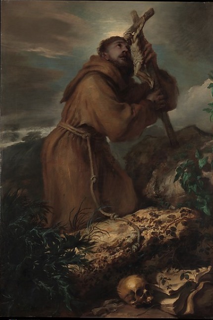 Describe: St. Francis is seen on a rocky cliff. He is kneeling down against a rock, looking up at the sky; while holding a crucifix. In this painting the artists uses contrast between light and dark colors. You can see the darkness of the clouds, and then the little light shining through. And you can also see the dark rocks, and then the flourishing green vines.