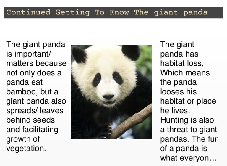 The giant panda is important/ matters because not only does a panda eat bamboo, but a giant panda also spreads/ leaves behind seeds and facilitating growth of vegetation.