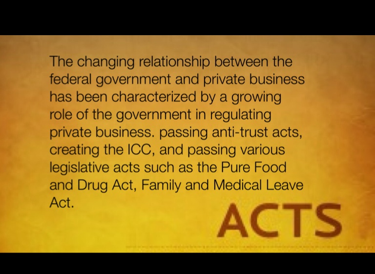 The changing relationship between the federal government and private business has been characterized by a growing role of the government in regulating private business. passing anti-trust acts, creating the ICC, and passing various legislative acts such as the Pure Food and Drug Act, Family and Medical Leave Act.