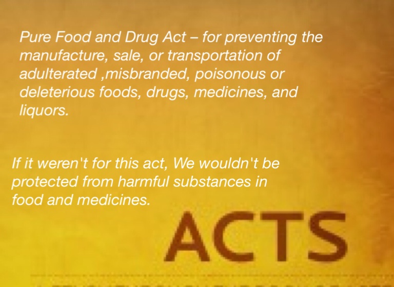 Pure Food and Drug Act – for preventing the manufacture, sale, or transportation of adulterated ,misbranded, poisonous or deleterious foods, drugs, medicines, and liquors.