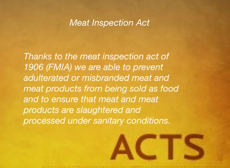 Thanks to the meat inspection act of 1906 (FMIA) we are able to prevent adulterated or misbranded meat and meat products from being sold as food and to ensure that meat and meat products are slaughtered and processed under sanitary conditions.