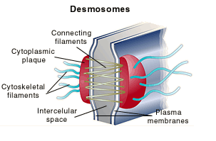 Desmosomes: mechanical couples that act like rivets along the sides of cells that prevent separation.