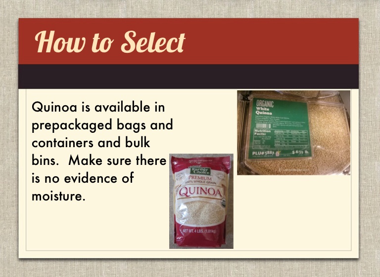 Quinoa is available in prepackaged bags and containers and bulk bins. Make sure there is no evidence of moisture.