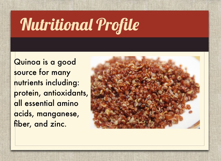 Quinoa is a good source for many nutrients including: protein, antioxidants, all essential amino acids, manganese, fiber, and zinc.