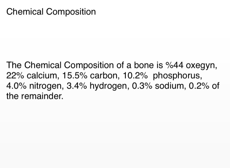 The Chemical Composition of a bone is %44 oxegyn, 22% calcium, 15.5% carbon, 10.2% phosphorus, 4.0% nitrogen, 3.4% hydrogen, 0.3% sodium, 0.2% of the remainder.