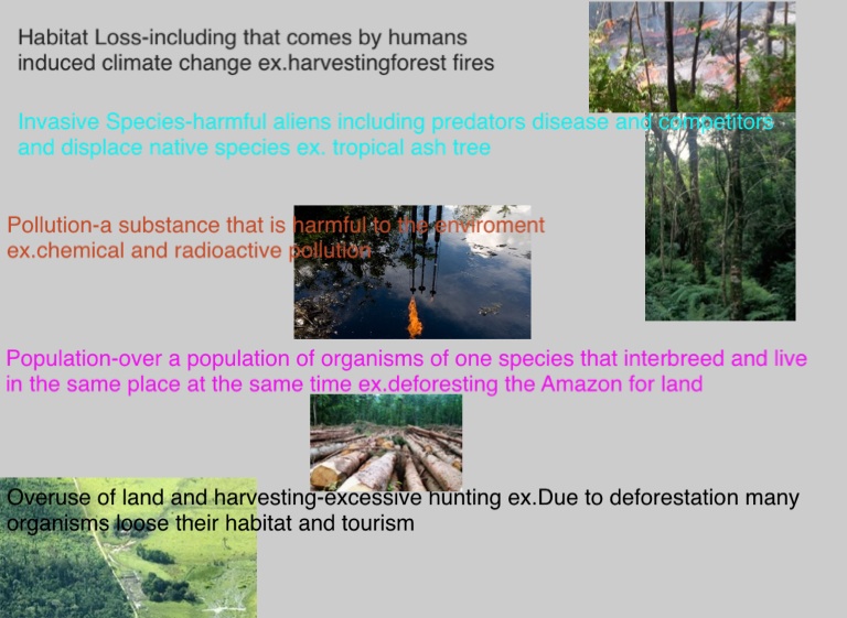 Overuse of land and harvesting-excessive hunting ex.Due to deforestation many organisms loose their habitat and tourism