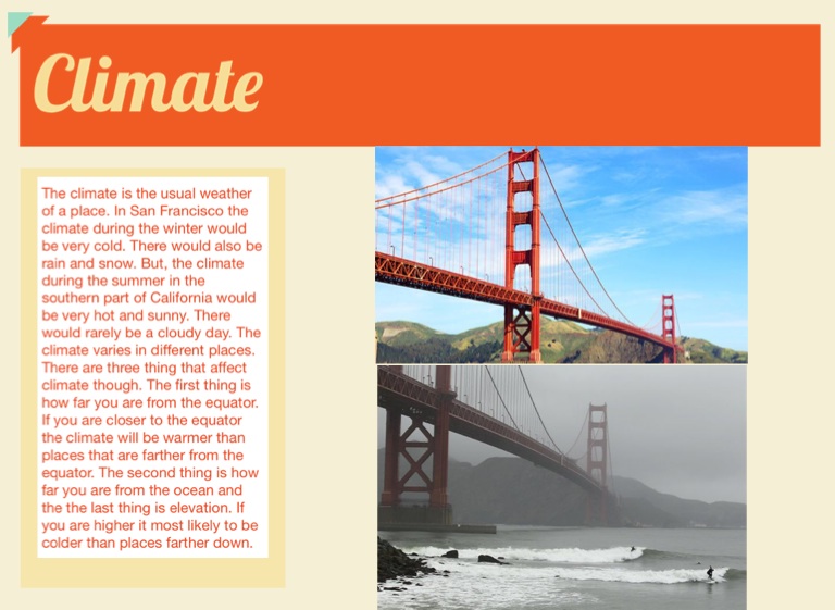 The climate is the usual weather of a place. In San Francisco the climate during the winter would be very cold. There would also be rain and snow. But, the climate during the summer in the southern part of California would be very hot and sunny. There would rarely be a cloudy day. The climate varies in different places. There are three thing that affect climate though. The first thing is how far you are from the equator. If you are closer to the equator the climate will be warmer than places that are farther from the equator. The second thing is how far you are from the ocean and the the last thing is elevation. If you are higher it most likely to be colder than places farther down.