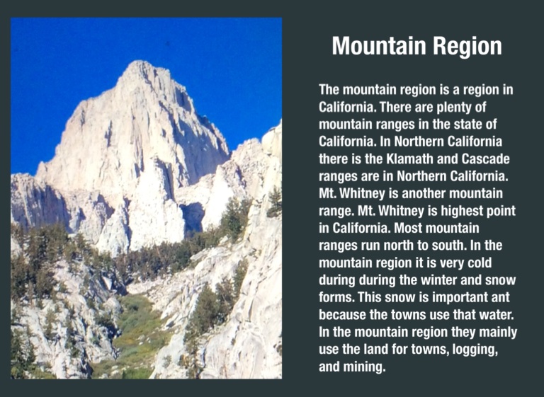 The mountain region is a region in California. There are plenty of mountain ranges in the state of California. In Northern California there is the Klamath and Cascade ranges are in Northern California. Mt. Whitney is another mountain range. Mt. Whitney is highest point in California. Most mountain ranges run north to south. In the mountain region it is very cold during during the winter and snow forms. This snow is important ant because the towns use that water. In the mountain region they mainly use the land for towns, logging, and mining.
