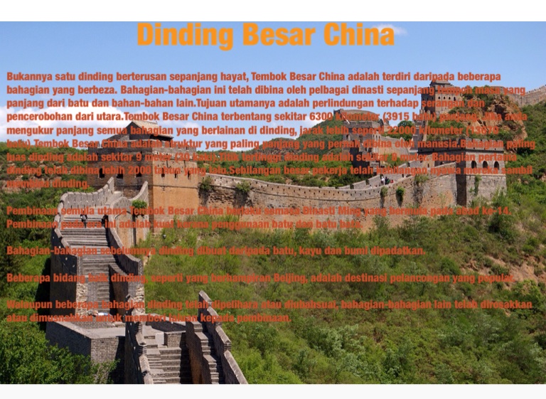 Bukannya satu dinding berterusan sepanjang hayat, Tembok Besar China adalah terdiri daripada beberapa bahagian yang berbeza. Bahagian-bahagian ini telah dibina oleh pelbagai dinasti sepanjang tempoh masa yang panjang dari batu dan bahan-bahan lain.Tujuan utamanya adalah perlindungan terhadap serangan dan pencerobohan dari utara.Tembok Besar China terbentang sekitar 6300 kilometer (3915 batu) panjang. Jika anda mengukur panjang semua bahagian yang berlainan di dinding, jarak lebih seperti 22000 kilometer (13670 batu).Tembok Besar China adalah struktur yang paling panjang yang pernah dibina oleh manusia.Bahagian paling luas dinding adalah sekitar 9 meter (30 kaki).Titik tertinggi dinding adalah sekitar 8 meter. Bahagian pertama dinding telah dibina lebih 2000 tahun yang lalu.Sebilangan besar pekerja telah kehilangan nyawa mereka sambil membina dinding.