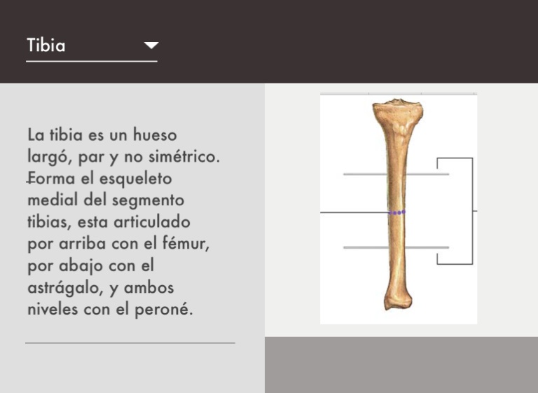 La tibia es un hueso largó, par y no simétrico. Forma el esqueleto medial del segmento tibias, esta articulado por arriba con el fémur, por abajo con el astrágalo, y ambos niveles con el peroné.