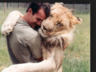 Kevin Richardson, a zoologist, known as a "Lion Whisper" hugging a wild animal.
