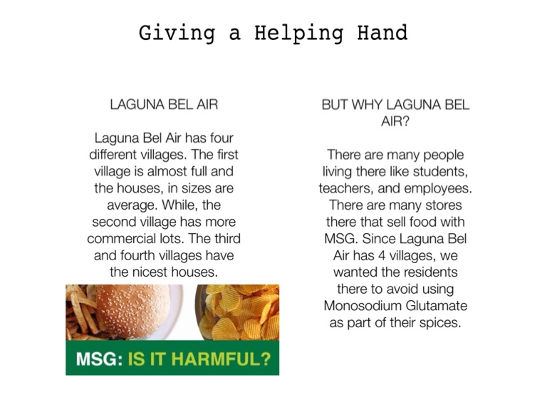 There are many people living there like students, teachers, and employees. There are many stores there that sell food with MSG. Since Laguna Bel Air has 4 villages, we wanted the residents there to avoid using Monosodium Glutamate as part of their spices.