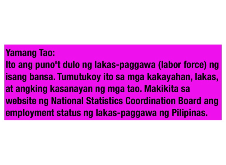 Ito ang puno't dulo ng lakas-paggawa (labor force) ng isang bansa. Tumutukoy ito sa mga kakayahan, lakas, at angking kasanayan ng mga tao. Makikita sa website ng National Statistics Coordination Board ang employment status ng lakas-paggawa ng Pilipinas.
