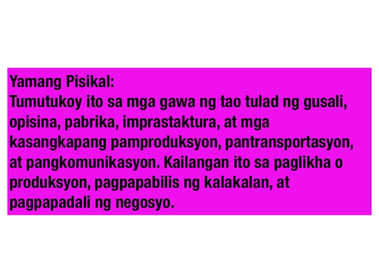 Tumutukoy ito sa mga gawa ng tao tulad ng gusali, opisina, pabrika, imprastaktura, at mga kasangkapang pamproduksyon, pantransportasyon, at pangkomunikasyon. Kailangan ito sa paglikha o produksyon, pagpapabilis ng kalakalan, at pagpapadali ng negosyo.