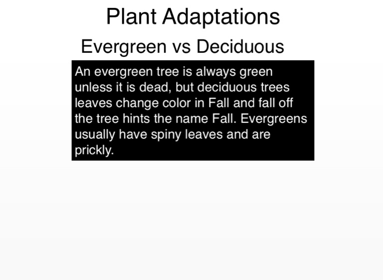 An evergreen tree is always green unless it is dead, but deciduous trees leaves change color in Fall and fall off the tree hints the name Fall. Evergreens usually have spiny leaves and are prickly.