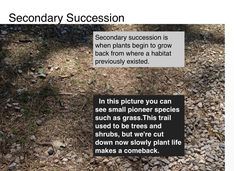 In this picture you can see small pioneer species such as grass.This trail used to be trees and shrubs, but we're cut down now slowly plant life makes a comeback.