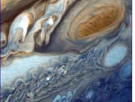 Jupiter is a sandy, rusty, blueish color. It is this color because colorful cloud bands composed of ammonia and ammonia compounds with unknown chemicals provide the colors.