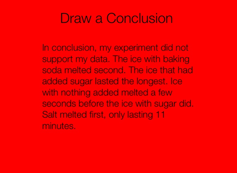 In conclusion, my experiment did not support my data. The ice with baking soda melted second. The ice that had added sugar lasted the longest. Ice with nothing added melted a few seconds before the ice with sugar did. Salt melted first, only lasting 11 minutes.