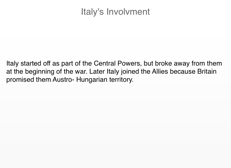 Italy started off as part of the Central Powers, but broke away from them at the beginning of the war. Later Italy joined the Allies because Britain promised them Austro- Hungarian territory.