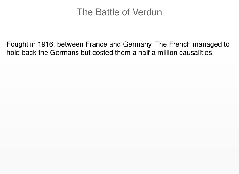 Fought in 1916, between France and Germany. The French managed to hold back the Germans but costed them a half a million causalities.