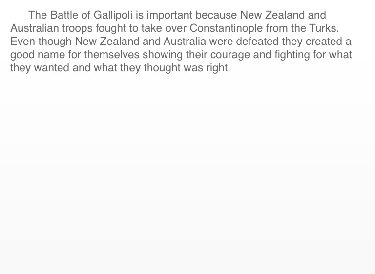 The Battle of Gallipoli is important because New Zealand and Australian troops fought to take over Constantinople from the Turks. Even though New Zealand and Australia were defeated they created a good name for themselves showing their courage and fighting for what they wanted and what they thought was right.