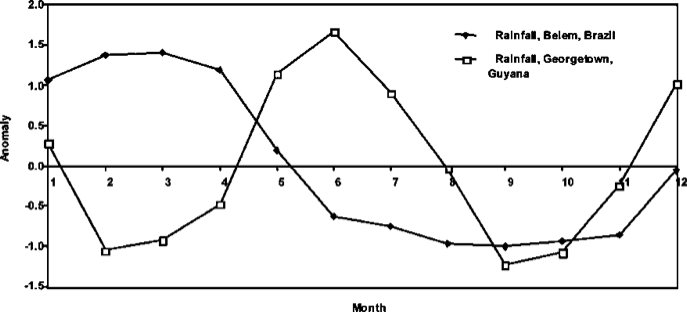 The rainfall of Belem starts up high and drops to negative from month 6-12.