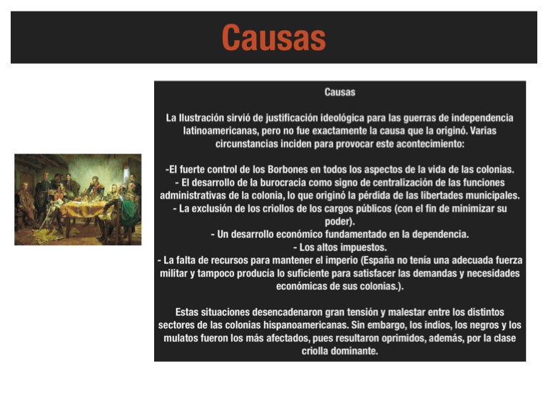 La Ilustración sirvió de justificación ideológica para las guerras de independencia latinoamericanas, pero no fue exactamente la causa que la originó. Varias circunstancias inciden para provocar este acontecimiento: