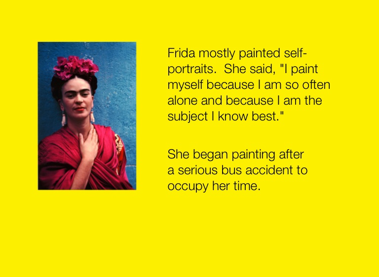 Frida mostly painted self-portraits. She said, "I paint myself because I am so often alone and because I am the subject I know best."