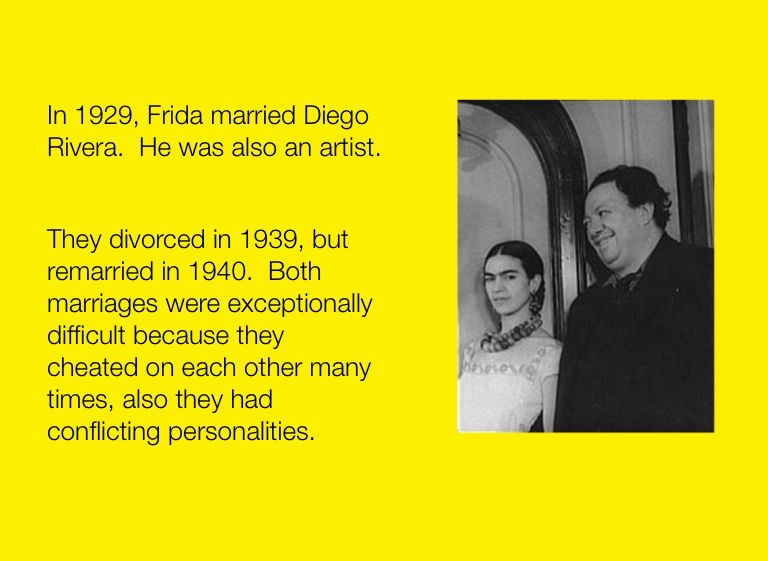 In 1929, Frida married Diego Rivera. He was also an artist.