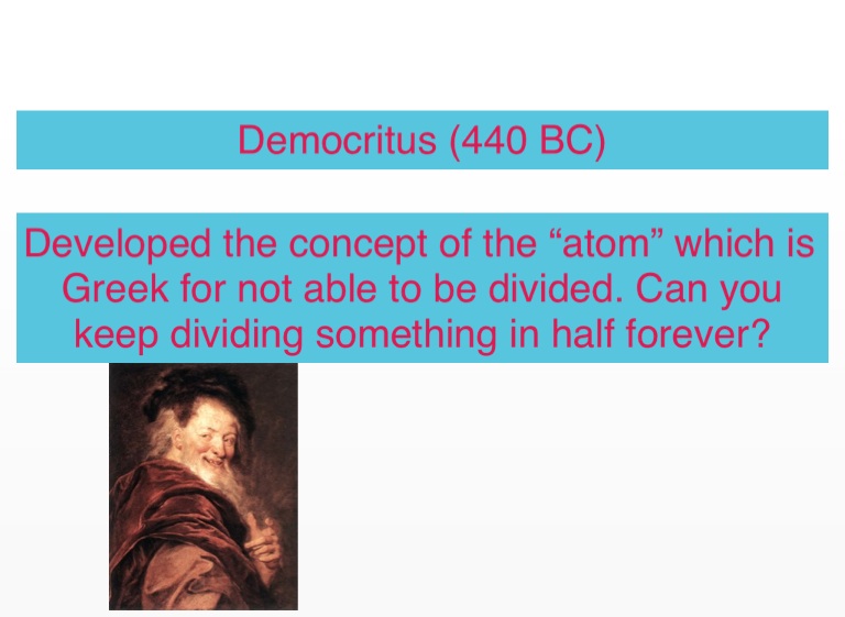 Developed the concept of the “atom” which is Greek for not able to be divided. Can you keep dividing something in half forever?