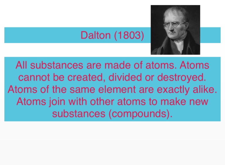 All substances are made of atoms. Atoms cannot be created, divided or destroyed. Atoms of the same element are exactly alike.