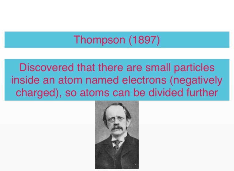 Discovered that there are small particles inside an atom named electrons (negatively charged), so atoms can be divided further