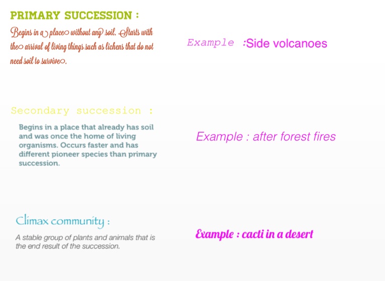 Begins in a place that already has soil and was once the home of living organisms. Occurs faster and has different pioneer species than primary succession.