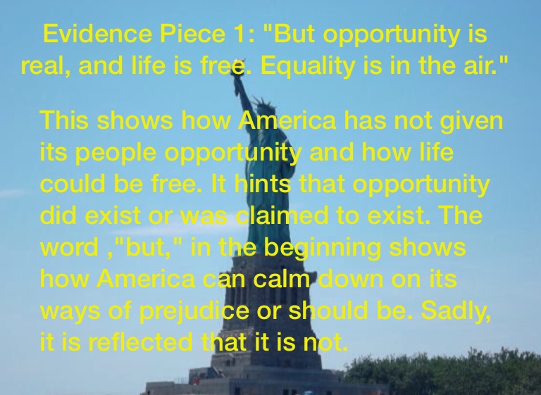 This shows how America has not given its people opportunity and how life could be free. It hints that opportunity did exist or was claimed to exist. The word ,"but," in the beginning shows how America can calm down on its ways of prejudice or should be. Sadly, it is reflected that it is not.
