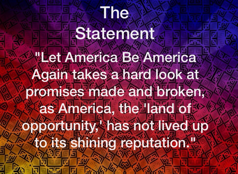 "Let America Be America Again takes a hard look at promises made and broken, as America, the 'land of opportunity,' has not lived up to its shining reputation."