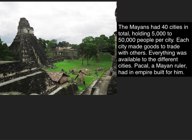 The Mayans had 40 cities in total, holding 5,000 to 50,000 people per city. Each city made goods to trade with others. Everything was available to the different cities. Pacal, a Mayan ruler, had in empire built for him.