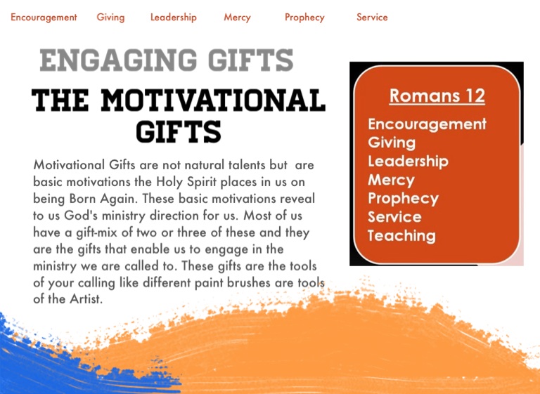 Motivational Gifts are not natural talents but are basic motivations the Holy Spirit places in us on being Born Again. These basic motivations reveal to us God's ministry direction for us. Most of us have a gift-mix of two or three of these and they are the gifts that enable us to engage in the ministry we are called to. These gifts are the tools of your calling like different paint brushes are tools of the Artist.