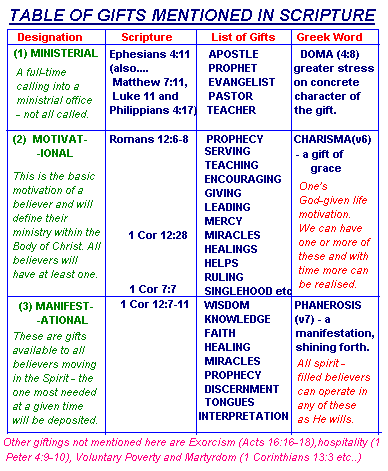 To the right is a more complete list of the gifts in their different categories. All the fits are tools of your calling, so finding out the gifts you've been given will greatly aid you in knowing the area of ministry God is calling you to. This little presentation has been a brief introduction but you can find out more by clicking the button below.....
