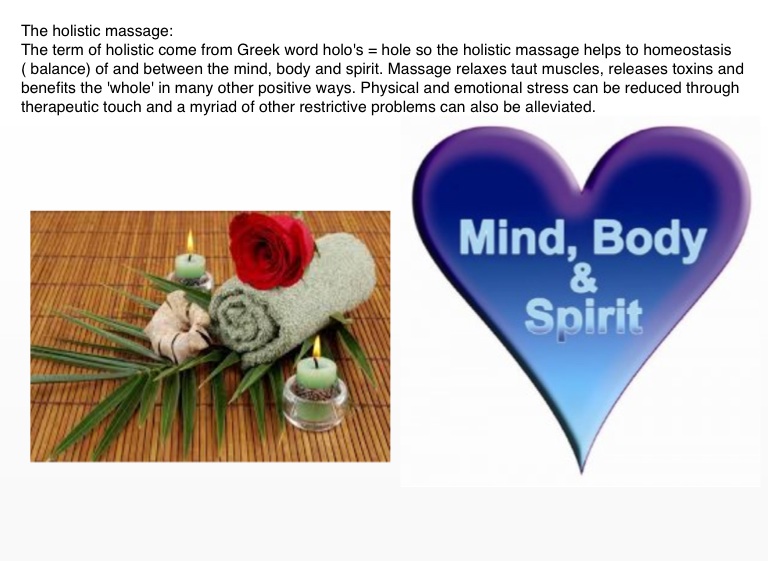 The term of holistic come from Greek word holo's = hole so the holistic massage helps to homeostasis ( balance) of and between the mind, body and spirit. Massage relaxes taut muscles, releases toxins and benefits the 'whole' in many other positive ways. Physical and emotional stress can be reduced through therapeutic touch and a myriad of other restrictive problems can also be alleviated.