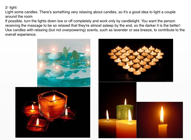 Use candles with relaxing (but not overpowering) scents, such as lavender or sea breeze, to contribute to the overall experience.