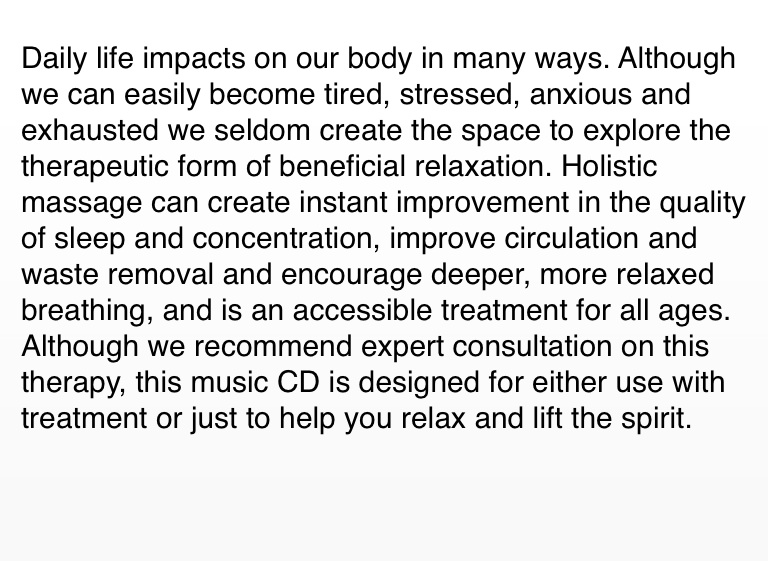 Daily life impacts on our body in many ways. Although we can easily become tired, stressed, anxious and exhausted we seldom create the space to explore the therapeutic form of beneficial relaxation. Holistic massage can create instant improvement in the quality of sleep and concentration, improve circulation and waste removal and encourage deeper, more relaxed breathing, and is an accessible treatment for all ages. Although we recommend expert consultation on this therapy, this music CD is designed for either use with treatment or just to help you relax and lift the spirit.