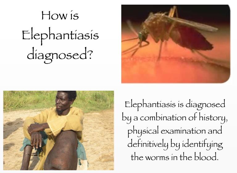 Elephantiasis is diagnosed by a combination of history, physical examination and definitively by identifying the worms in the blood.